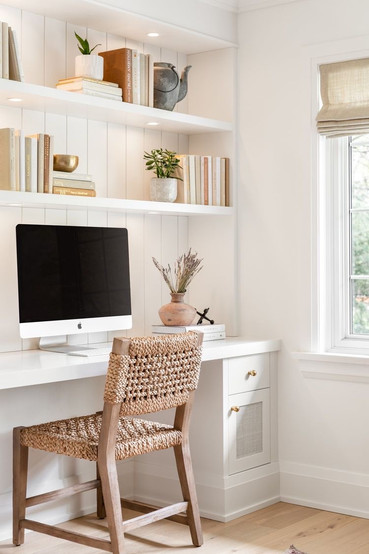 A neutral base of whites, creams, woods, and nudes can create a cozy and warm atmosphere, while pops of colour can add a playful and fun touch. So don't be afraid to incorporate some bright and bold accents into your space to add some light and life to your workday!